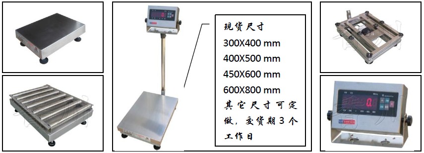 稱重儀表: LEF數(shù)碼顯示,清晰易讀, 內(nèi)置可充蓄電池,交直流兩用 304不銹鋼材質(zhì),抗干擾能力出色 具歸零、扣重、累加、單位轉(zhuǎn)換等功能 多臺(tái)面尺寸,量程從30kg到1000kg可選 可充電電池供電,充電一次可連續(xù)使用90小時(shí)